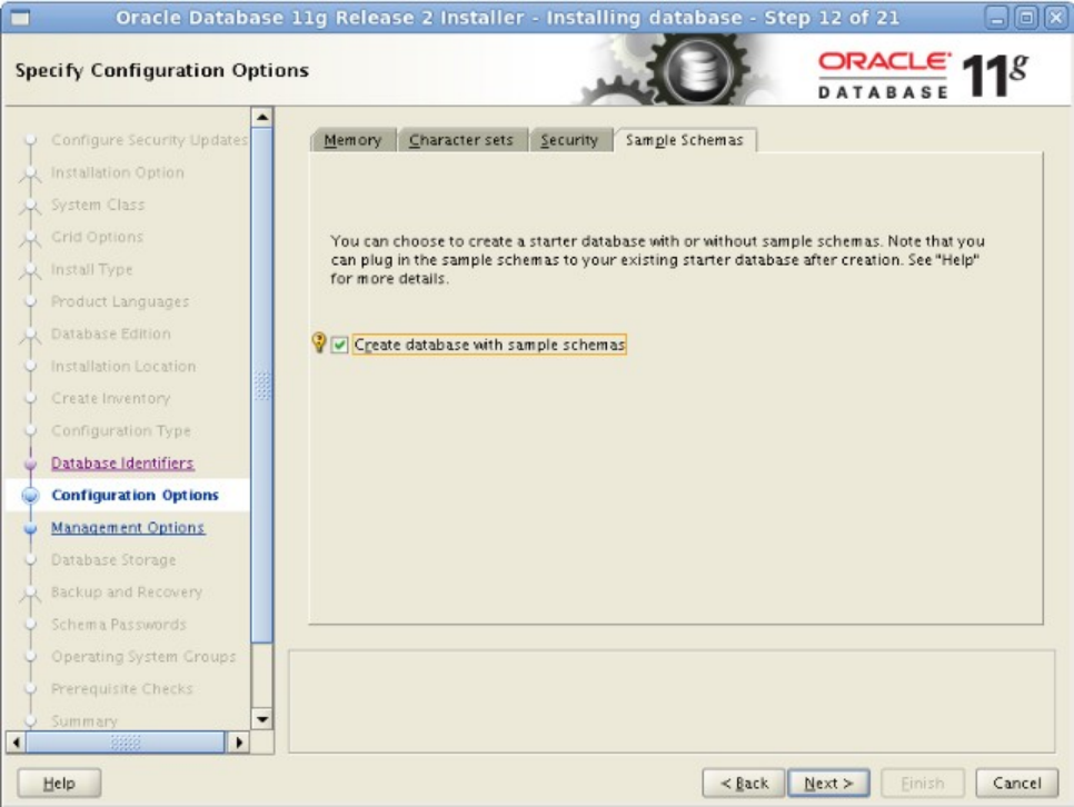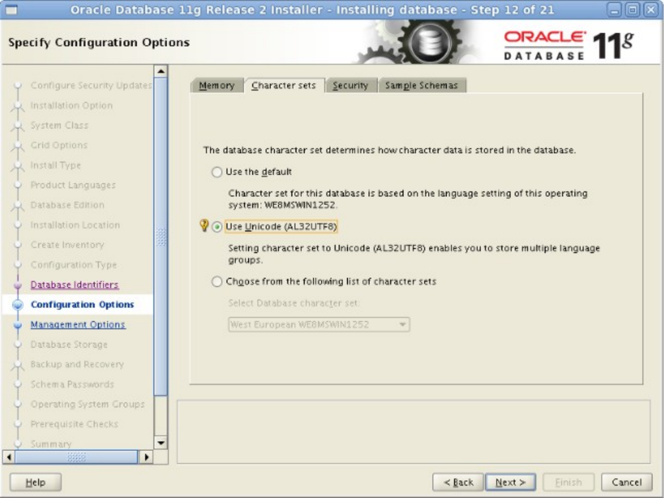 图-13.2 选择UTF-8作为数据库字符集,点击Sample Schemas顺便创建Oracle提供的案例