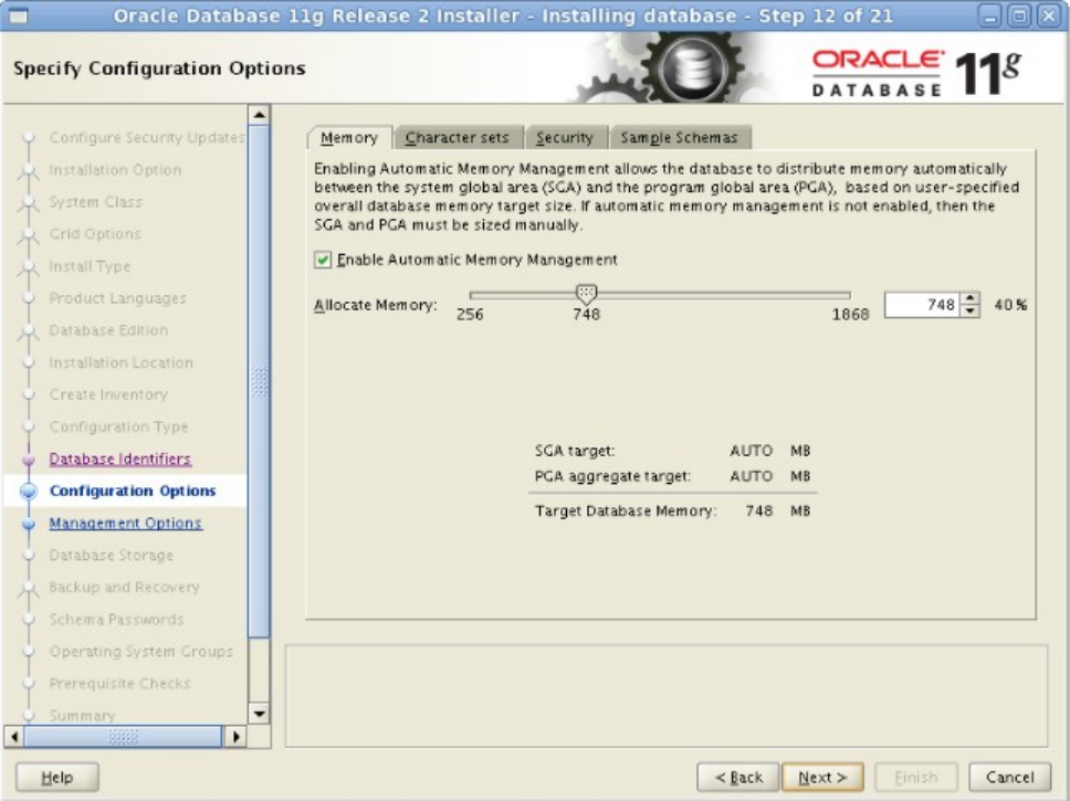 图-13.1 可使用的最大内存,Oracle建议使用自动内存管理,点击选项卡Character sets选择字符集