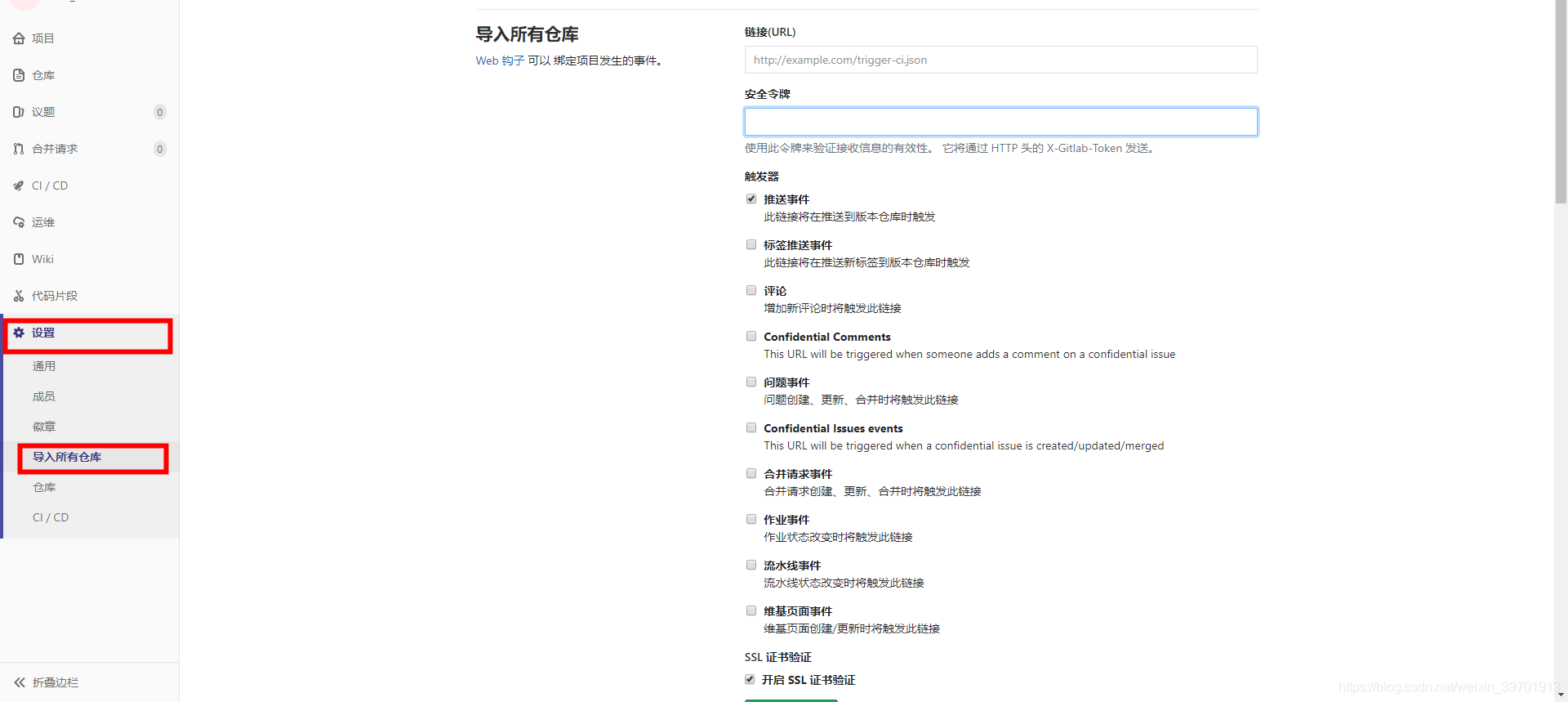 1.在jenkins插件中下载对用插件 2.在构建任务中设置配置,复制url,然后点击高级,点击generate生成token 3.在gitlab中找到对应的项目,在设置,导入所有仓库中设置配置,输入刚刚复制的url,还有token 4.添加 5.测试