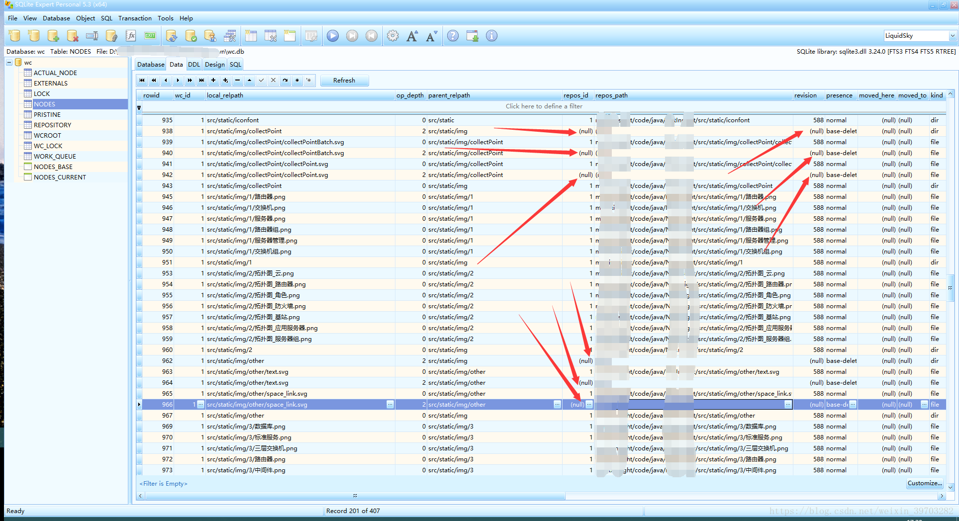 项目开发中很久没提交和了,这次提交更新时遇到代码报错,和开发人员一商量说某个目录下的文件没有更新完全,让我再更新下,然后又是clean up,又是revert都不行,始终更新不下来,通过SQLite Expert Professional打开项目根目录下的wc.db,打开NODES表找到有异常的数据行和自己已知没有下载下来文件的名称行删除