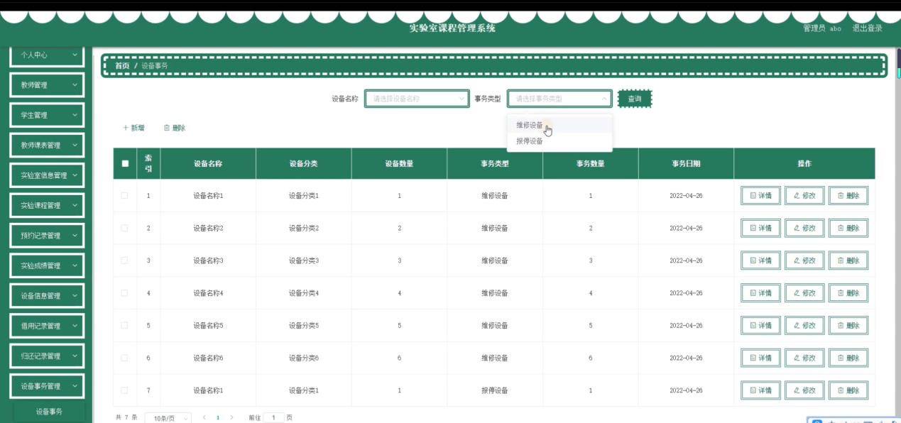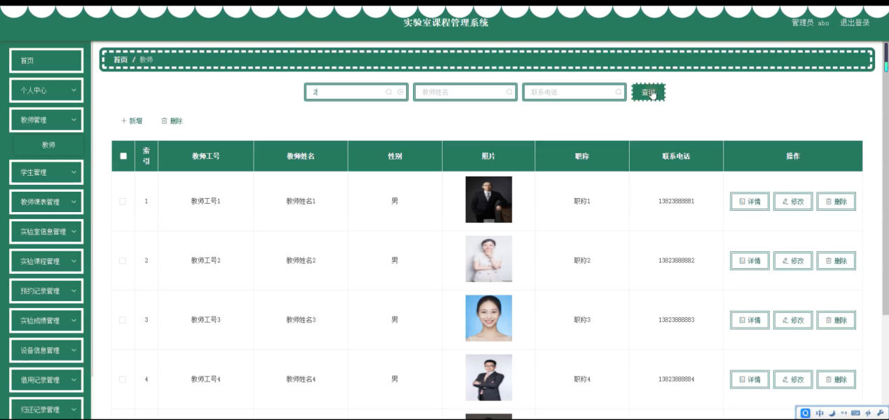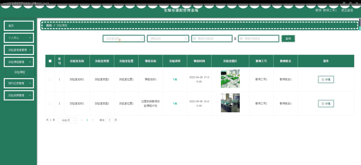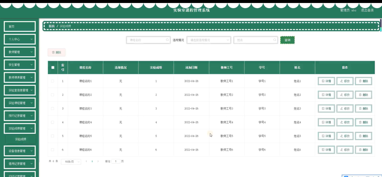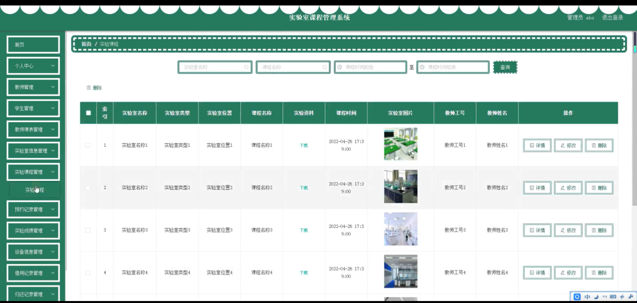 实验课程管理,在实验课程管理页面可以对索引、实验室名称、实验室类型、实验室位置、课程名称、实验资料、课程时间、实验室图片、教师工号、教师姓名等内容进行详情,修改和删除等操作,如图5-6所示。