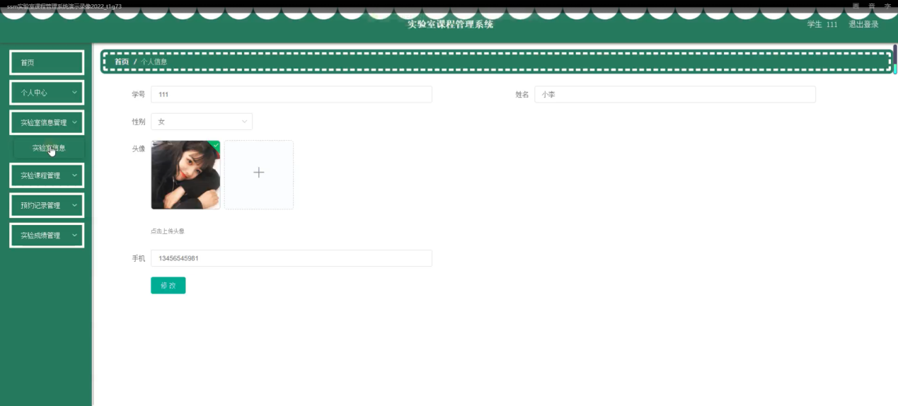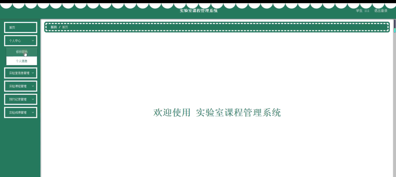 学生登录进入系统可以对首页、个人中心、实验室信息管理、实验课程管理、预约记录管理、实验成绩管理等进行相应操作,如图5-12所示。