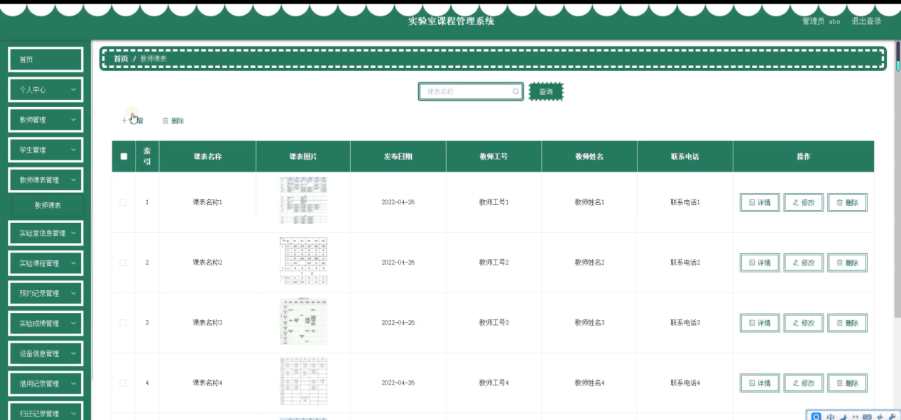 教师课表管理,在教师课表管理页面可以对索引、课表名称、课程图片、发布日期、教师工号、教师姓名、联系电话等内容进行详情,修改和删除等操作,如图5-4所示。