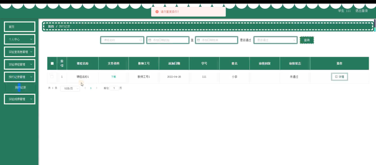 预约记录管理,在预约记录管理页面可以对索引、课程名称、文件资料、教师工号、添加日期、学号、姓名、审核回复、审核状态等内容进行详情或实验成绩等操作,如图5-20所示。