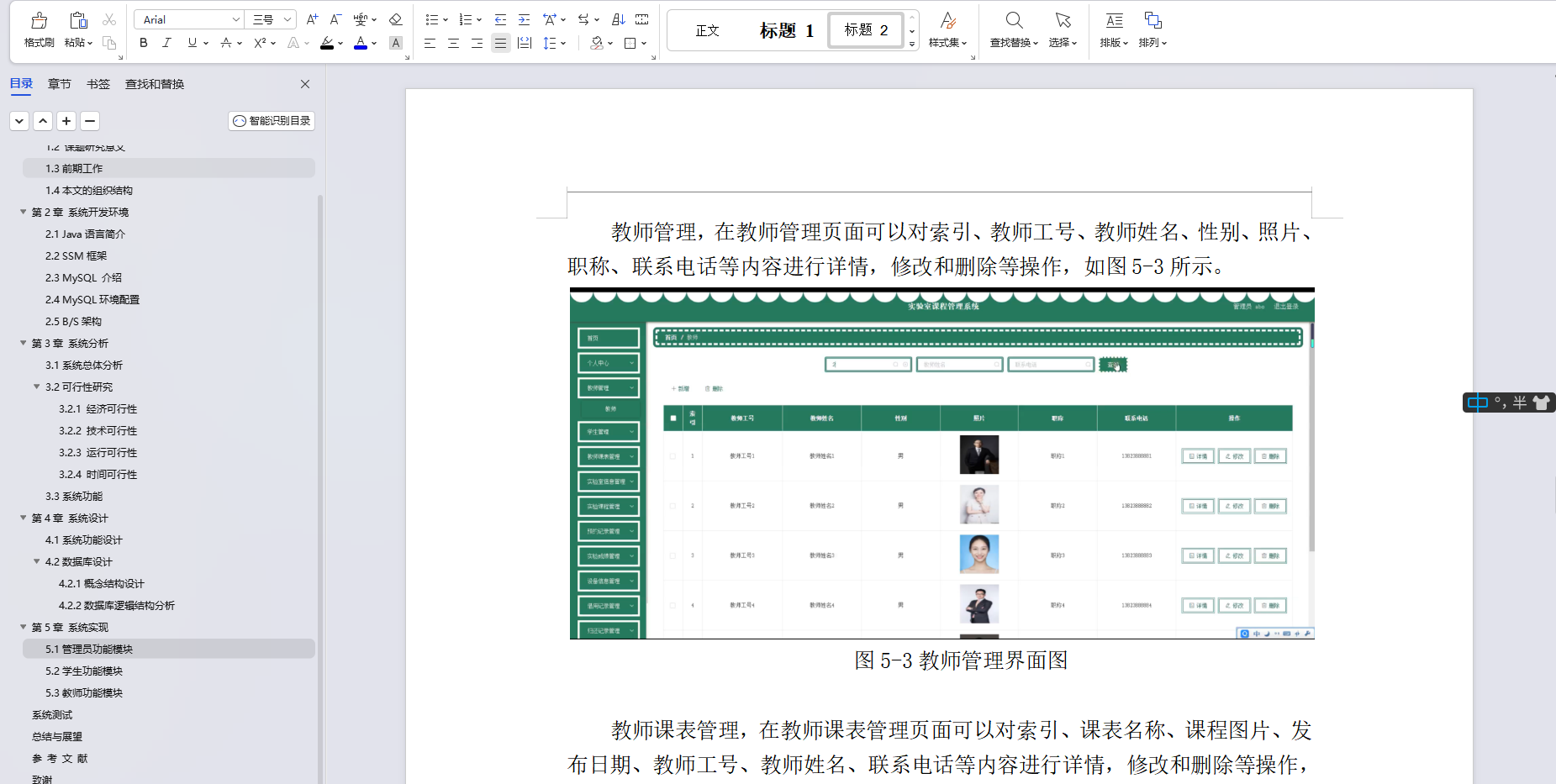 教师管理,在教师管理页面可以对索引、教师工号、教师姓名、性别、照片、职称、联系电话等内容进行详情,修改和删除等操作,如图5-3所示。