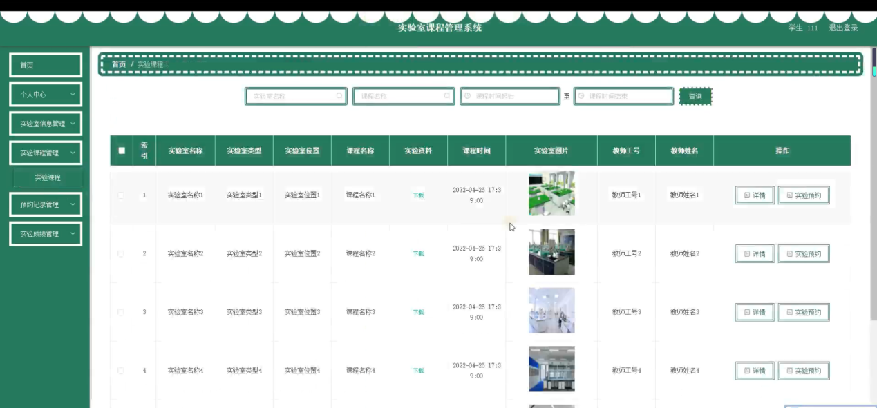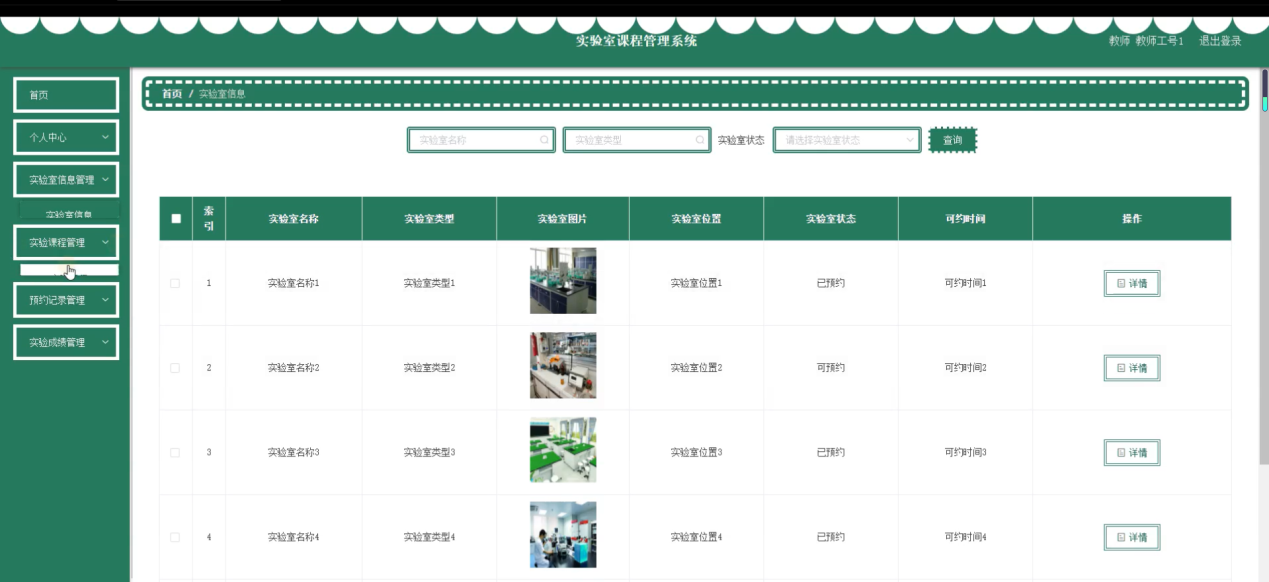 实验课程管理,在实验课程管理页面可以对索引、实验室名称、实验室类型、实验室位置、课程名称、实验资料、课程时间、实验室图片、教师工号、教师姓名等内容进行详情或实验预约等操作,如图5-15所示。