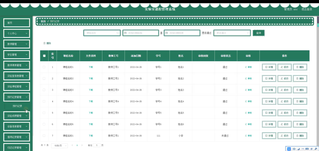 预约记录管理,在预约记录管理页面可以对索引、课程名称、文件资料、教师工号、添加日期、学号、姓名、审核回复、审核状态、审核等内容进行详情,修改和删除等操作,如图5-7所示。
