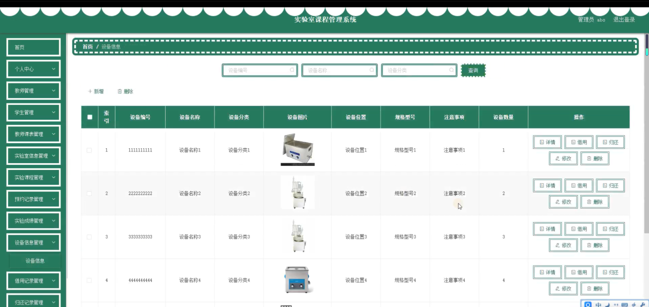 设备信息管理,在设备信息管理页面可以对索引、设备编号、设备名称、设备分类、设备图片、设备位置、规格型号、注意事项、设备数量等内容进行详情、借用、归还、修改和删除等操作,如图5-9所示。