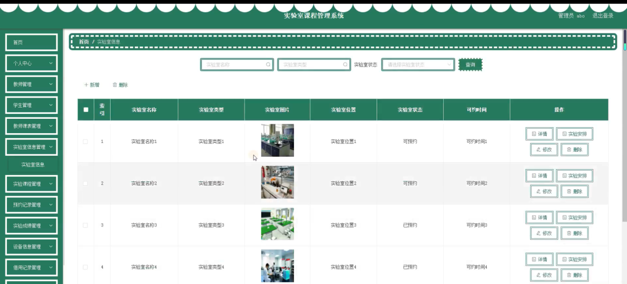 实验室信息管理,在实验室信息管理页面可以对索引、实验室名称、实验室类型、实验室图片、实验室位置、实验室状态、可约时间等内容进行详情、实验安排、修改和删除等操作,如图5-5所示。