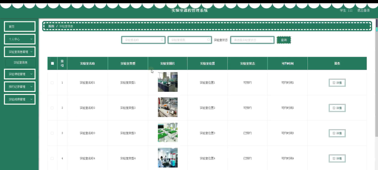 实验室信息管理,在实验室信息管理页面可以对索引、实验室名称、实验室类型、实验室图片、实验室位置、实验室状态、可约时间等内容进行详情等操作,如图5-18所示。