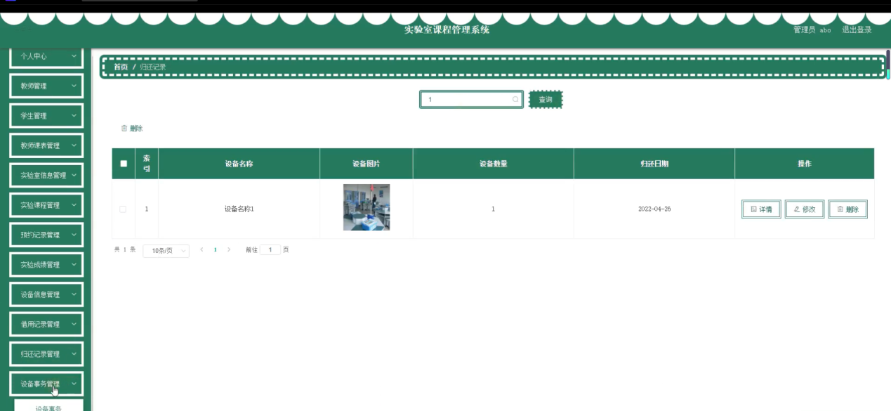 归还记录管理,在归还记录管理页面可以对索引、设备名称、设备图片、设备数量、归还日期等内容进行详情、修改和删除等操作,如图5-10所示。