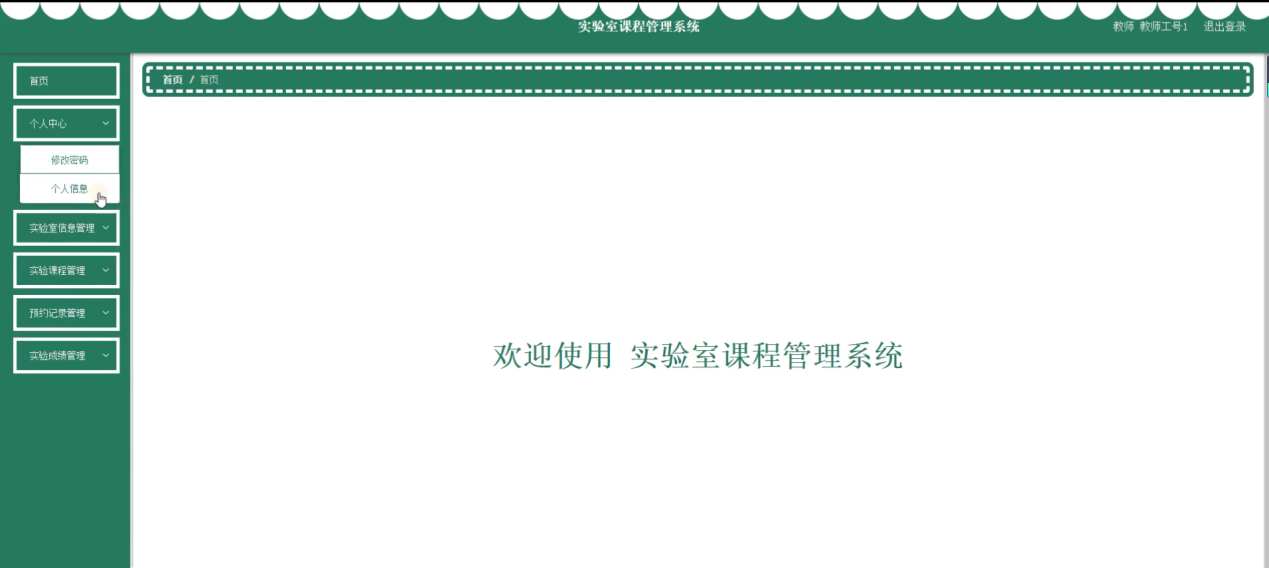 教师登录进入系统可以对首页、个人中心、实验室信息管理、实验课程管理、预约记录管理、实验成绩管理等进行相应操作,如图5-17所示。