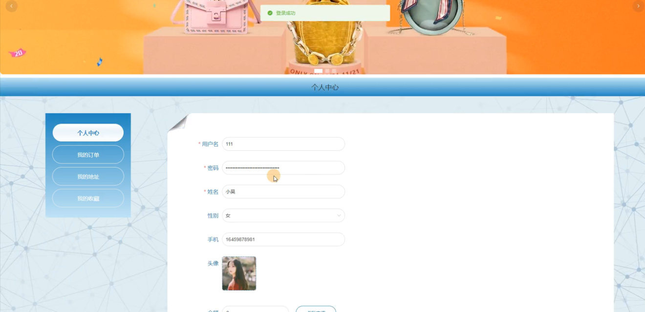 个人中心:在个人中心页面通过填写个人详细信息进行信息更新操作,还可以对我的收藏进行详细操作;个人中心页面如图5-5所示: