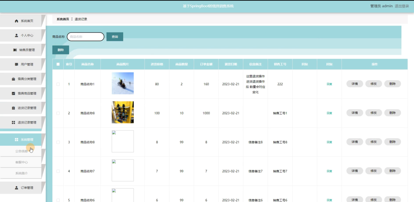 管理员点击退货记录管理。在退货记录页面输入商品名称进行查询或删除退货记录列表,并根据需要对退货记录详情信息进行详情、修改或删除操作;如图5-12所示: