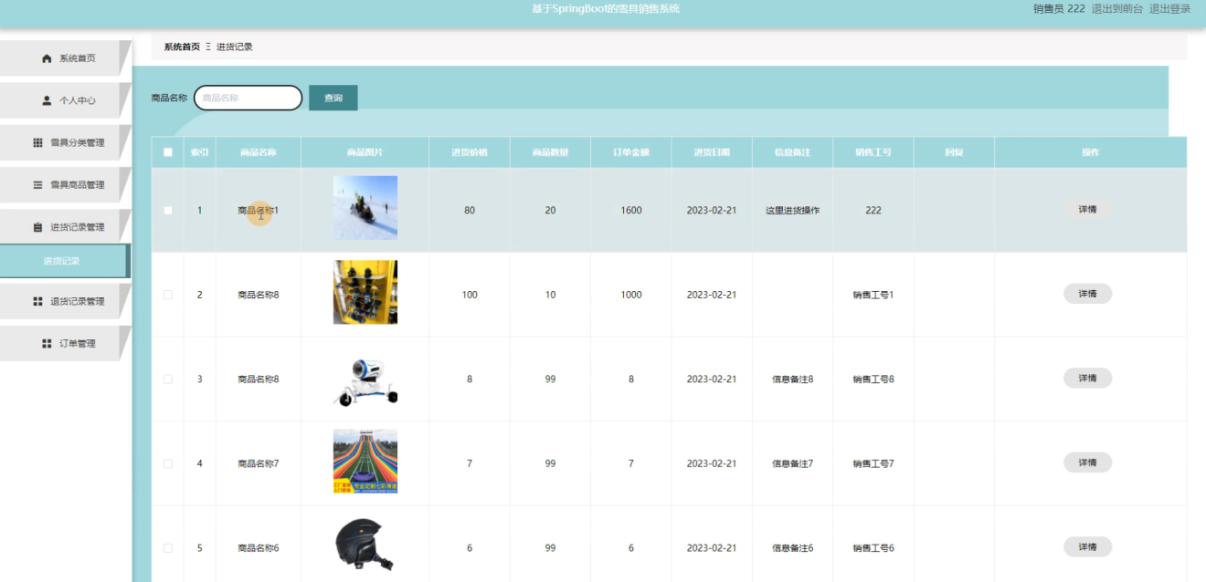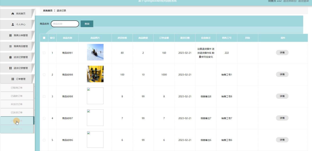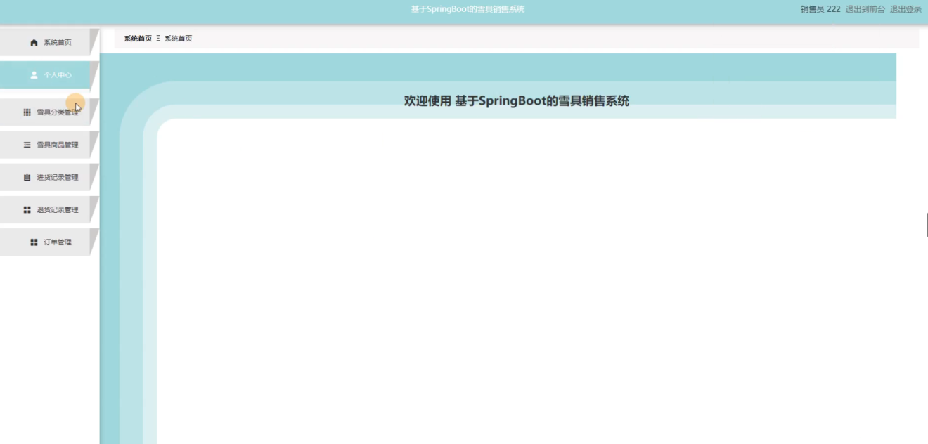 销售员进入系统可以对个人中心、雪具分类管理、雪具商品管理、进货记录管理、退货订单管理、订单管理等功能进行操作。销售员主页面如图5-14所示: