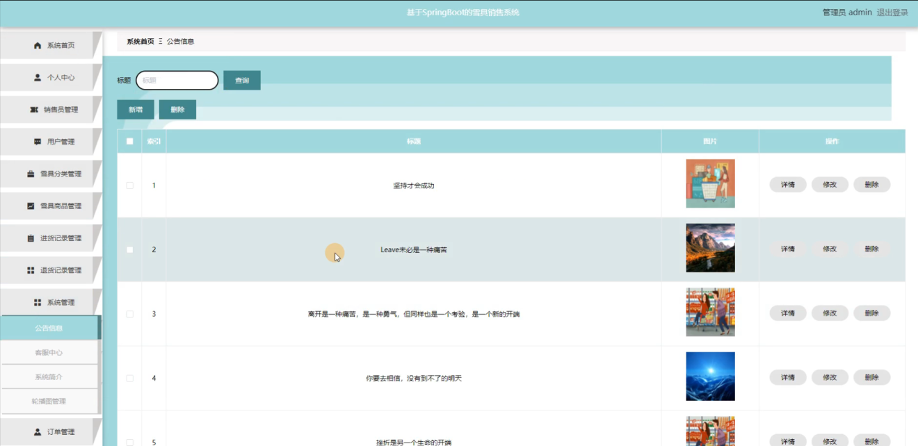 管理员点击系统管理。在公告信息页面输入标题进行查询、新增或删除公告信息列表,并根据需要对公告详情信息进行详情、修改或删除操作,还可对客服中心、系统简介、轮播图管理进行相应操作;如图5-13所示: