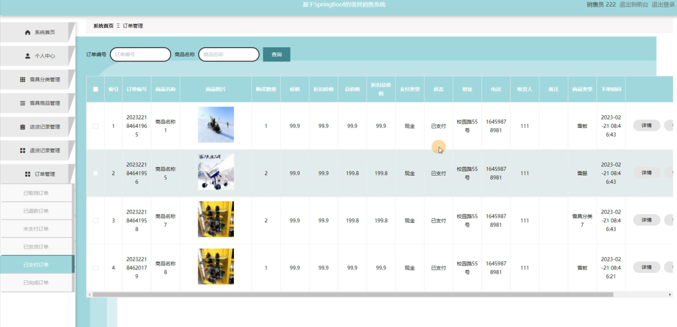 销售员点击订单管理。在已支付订单页面输入订单编号、商品名称进行查询已支付订单列表,并根据需要对已支付订单详情信息进行详情、物流或发货操作,还可对已取消订单、已退款订单、未支付订单、已发货订单、已完成订单进行相应操作;如图5-18所示:
