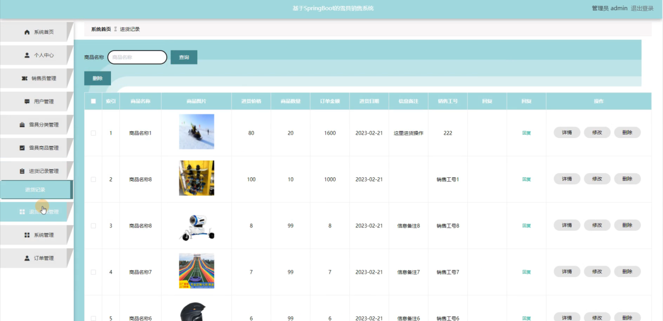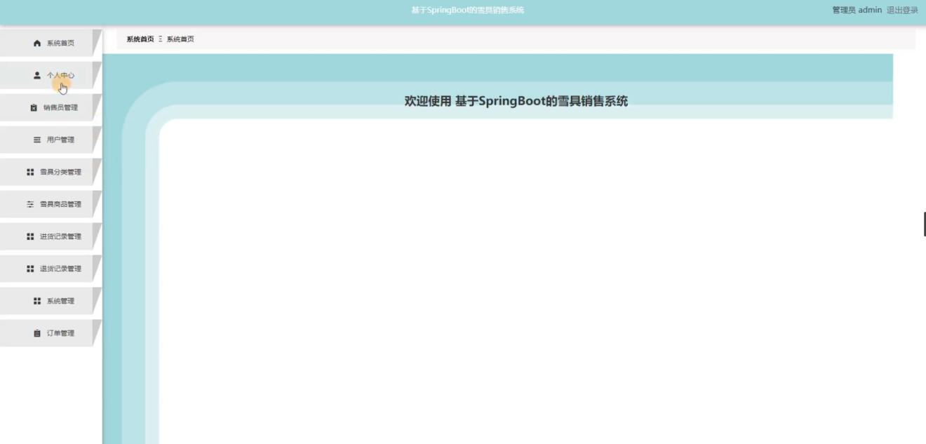 管理员进入主页面,主要功能包括对个人中心、销售员管理、用户管理、雪具分类管理、雪具商品管理、进货记录管理、退货记录管理、系统管理、订单管理等进行操作。管理员主页面如图5-7所示: