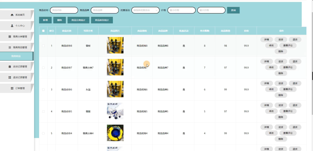 管理员点击雪具商品管理。在雪具商品页面输入商品名称、商品品牌、价格和选择优惠活动进行查询、商品分类统计、商品库存统计、新增或删除雪具商品列表,并根据需要对雪具商品详情信息进行详情、查看评论、修改或删除操作;如图5-10所示:
