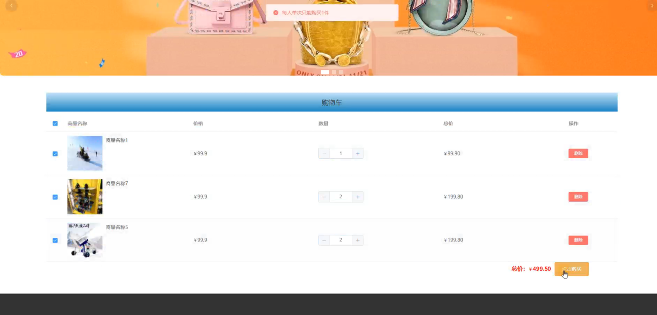 购物车:在购物车页面可以查看到商品名称、价格、数量、总价等详细信息,并进行点击购买或删除操作;购物车页面如图5-4所示: