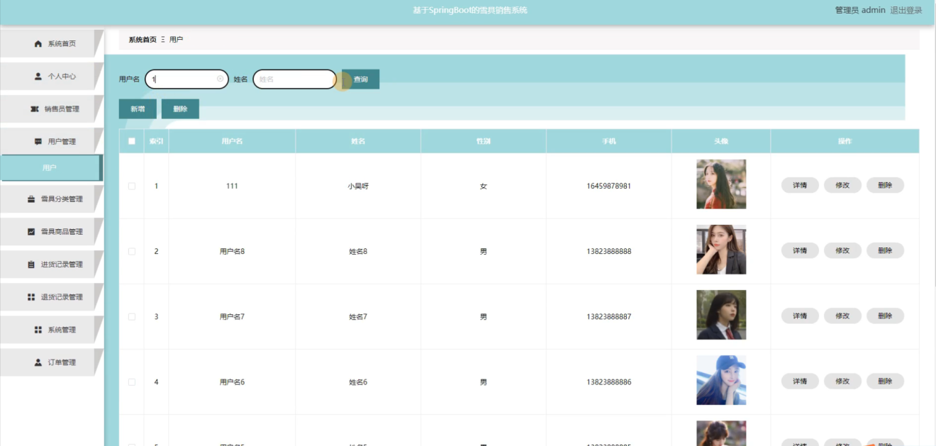 管理员点击用户管理。在用户页面输入用户名、姓名进行查询、新增或删除用户列表,并根据需要对用户详情信息进行详情、修改或删除操作;如图5-9所示: