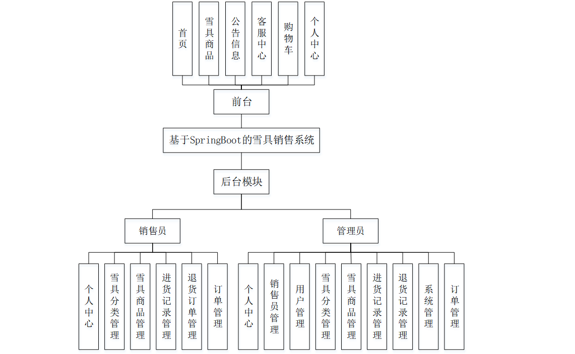 雪具销售系统的建设可以为雪具销售管理提供帮助,通过对一些基础信息管理实现针对性的安排,可以按照用户的角色权限使不同用户角色看到不一样的信息界面。现根据需求阶段的分析,我们可以大致确定系统需要包含的功能如下图所示: