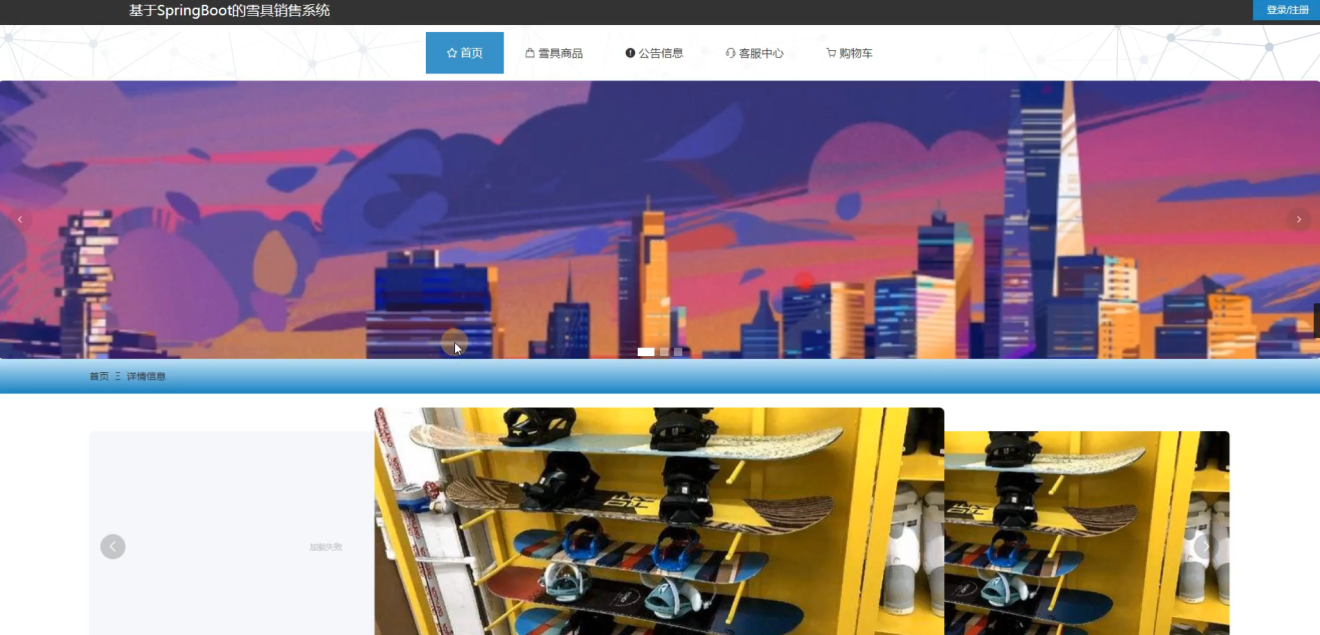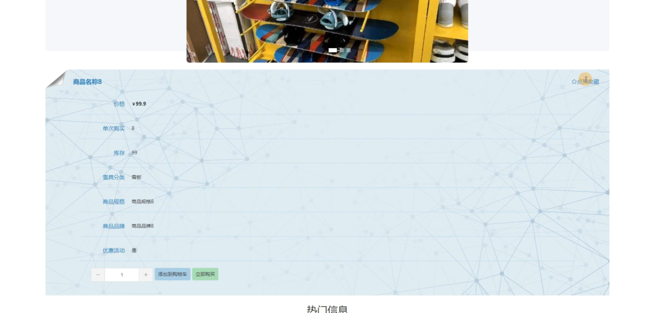 雪具商品:在雪具商品页面的输入栏中输入商品名称、商品品牌、价格和选择优惠活动进行查询,可以查看到雪具商品详细信息,并根据需要进行添加到购物车、立即购买操作;雪具商品页面如图5-3所示: