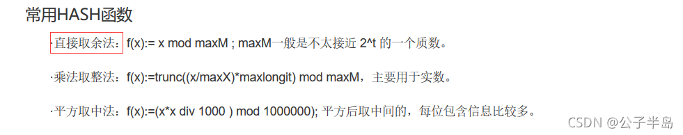 直接取余法:H(k)=k%m(m为关键字,k为数字)