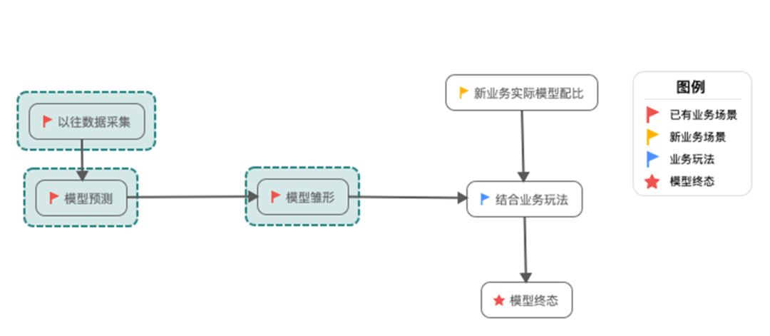 已有业务场景:采集以往数据并做处理,作为预测数据,形成一个模型雏形,结合新的业务玩法,形成已有业务的模型;