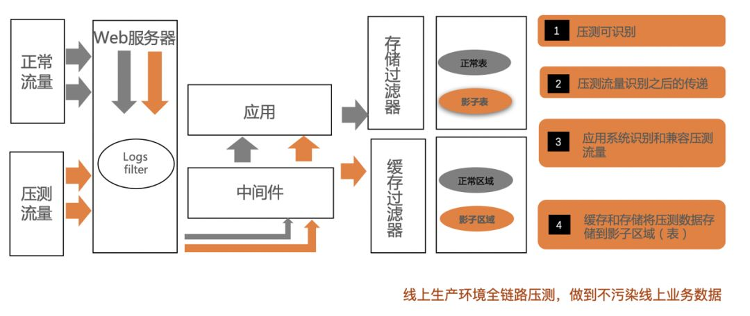 压测环境准备:需要复用真实的线上环境,压测结果和问题暴露才都是最真实情况。可通过压测流量全局识别、透传(数据进影子区域)。