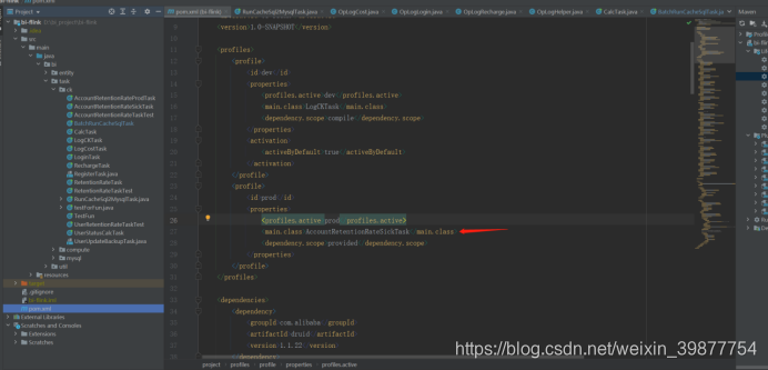平常maven包怎么打包这个就怎么来。在这个工程里进入pom.Xml更新对应环境的main.Class属性就行。填写的内容是任务的main方法所在对象的全路径。