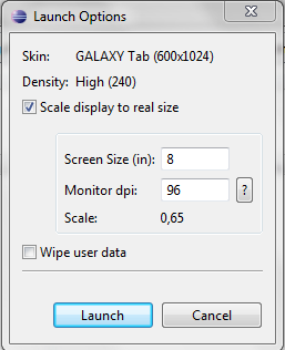 当我们启动一个新的平板电脑模拟器的时候,首先我们需要设置“Scale display to real size"选项,这将让平板电脑的屏幕大小与我们电脑屏幕的大小匹配。以我的电脑为例,我的屏幕大小是1440x900px。如下图所示: