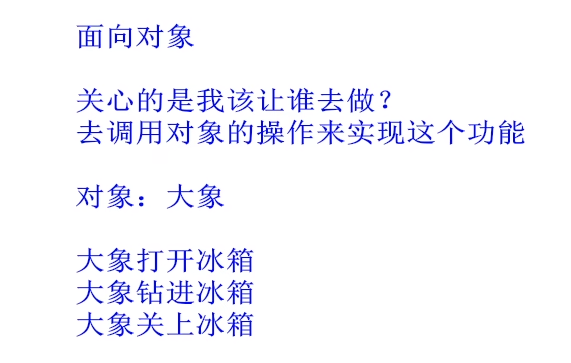 面向对象强调的,现在不是 “我”来打开冰箱,而是“我去调用冰箱和大象的操作”;