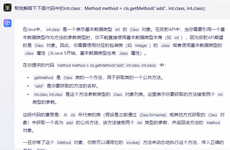 Method method = cls.getMethod("add", int.class, int.class); //getMethod为获取类中的方法,得到方法