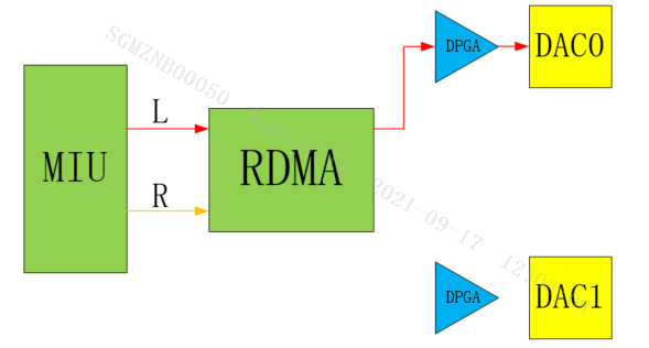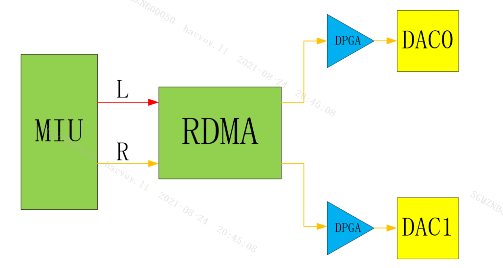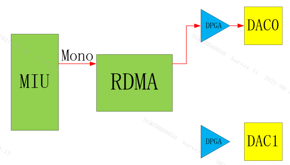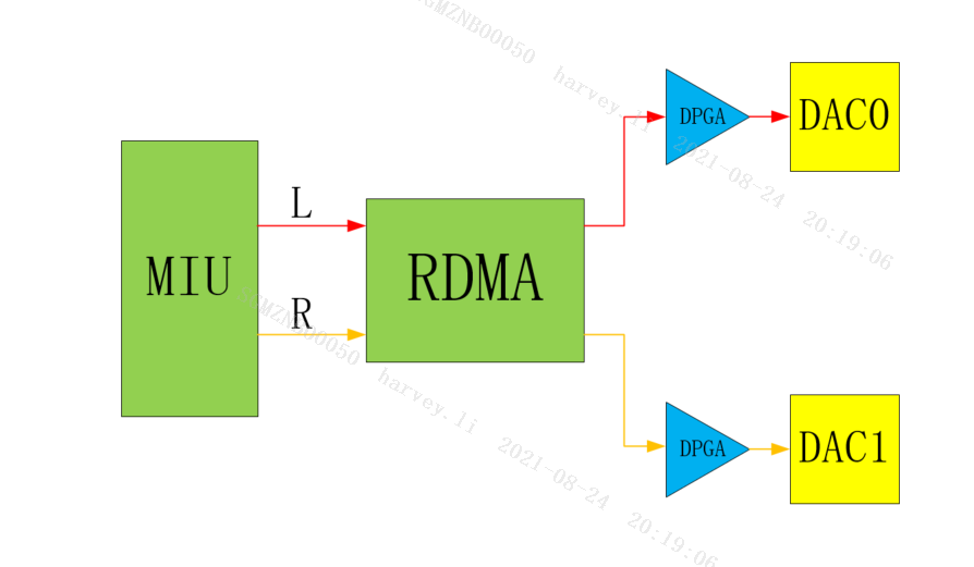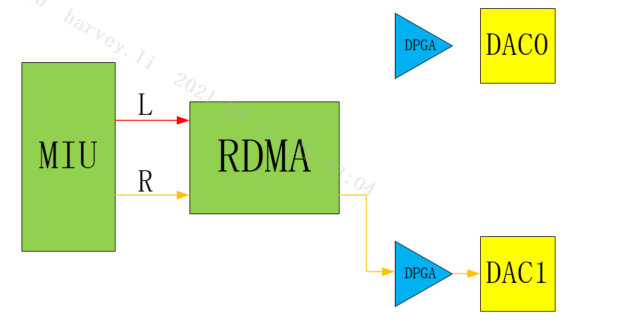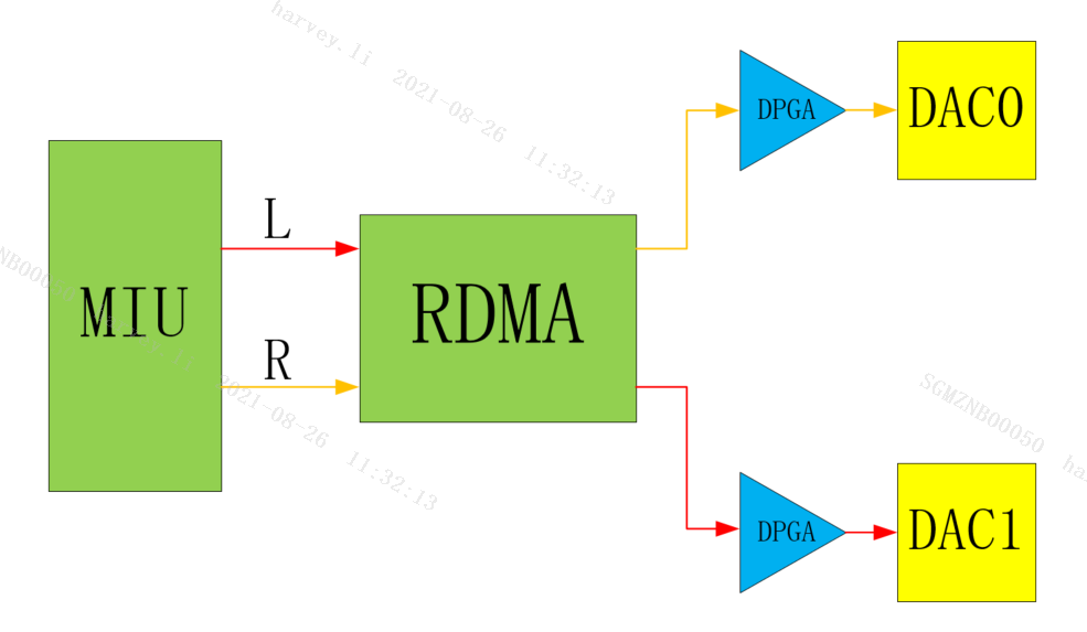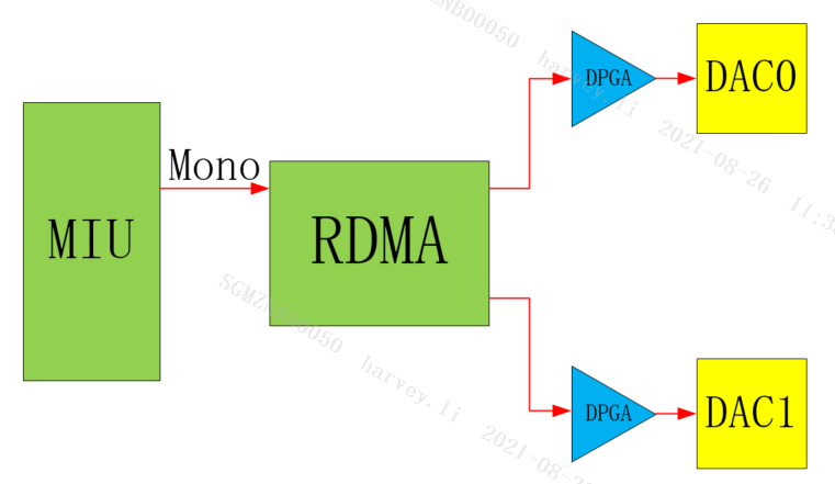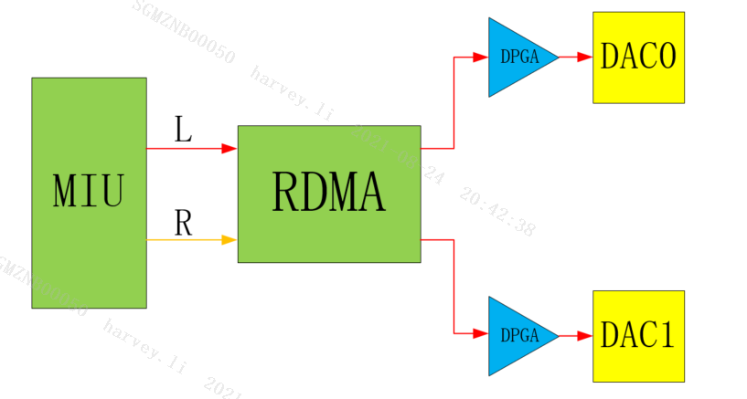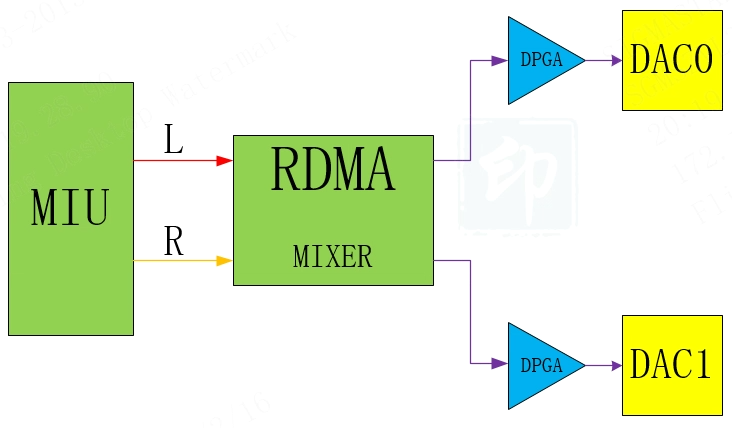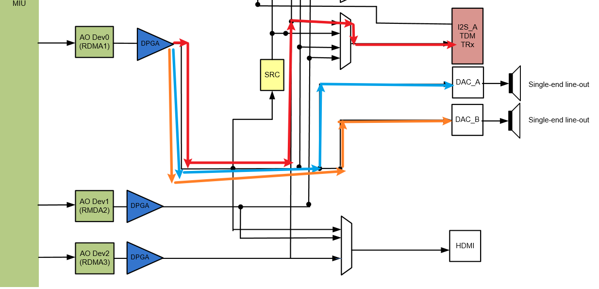 下图是将I2S TX和DAC0/1 Attach到RDMA1的结果,从RDMA1输出的信号经过DPGA做增益调节后,分成3个支路分别到达DAC0、DAC1和I2S TX。Ao Device的Attach就是在设定这些支路的流向。