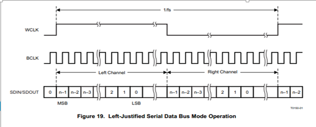 I2S Philips的对齐格式,样本数据的第一个数据位出现在WCLK(即左右通道切换时钟)跳变的第一个BCLK(即串行时钟)后。左对齐格式,样本数据的第一个数据位出现在WCLK(即左右通道切换时钟)跳变的第一个BCLK(即串行时钟)内,且WCLK的极性与I2S Philips的对齐格式相反。
