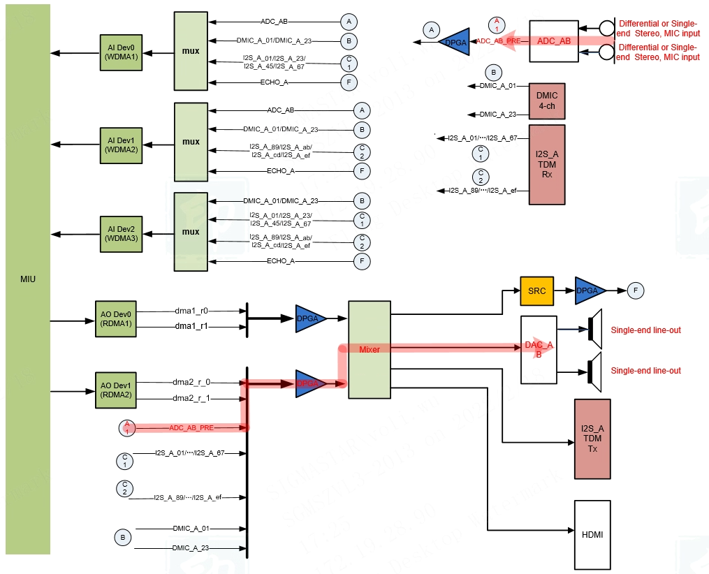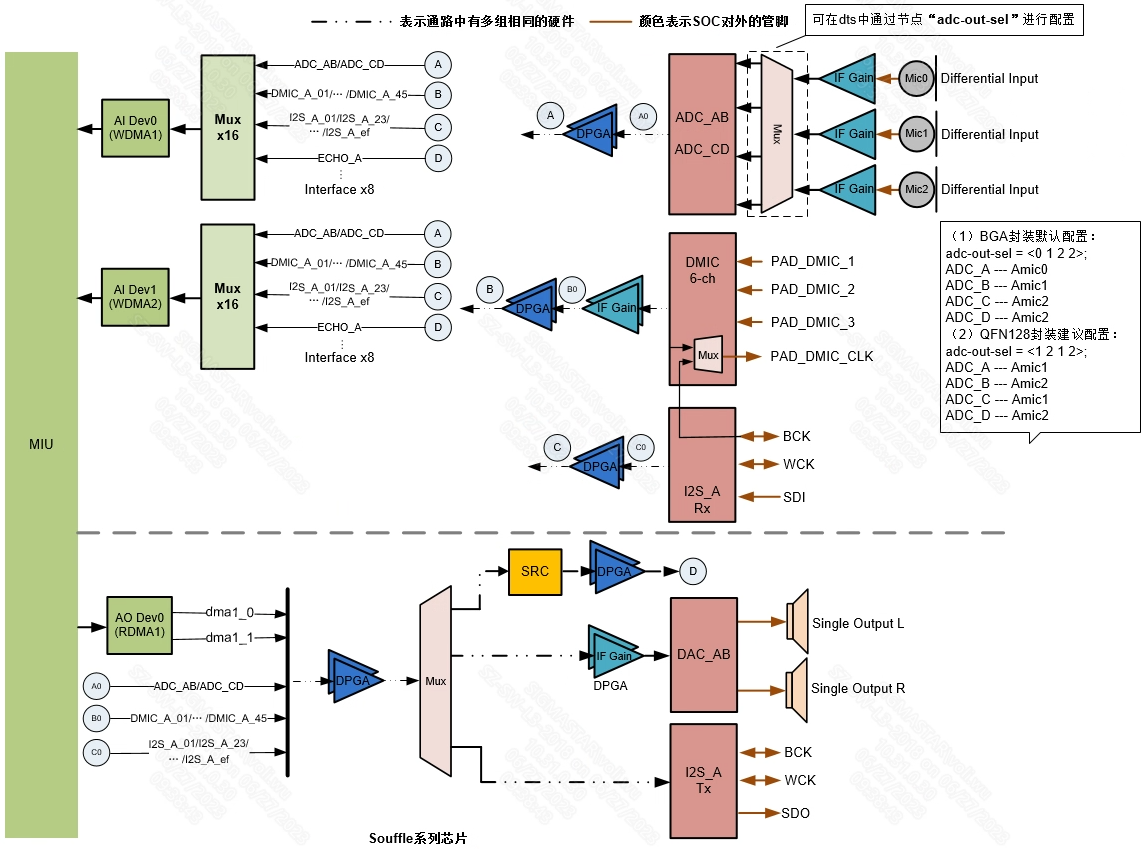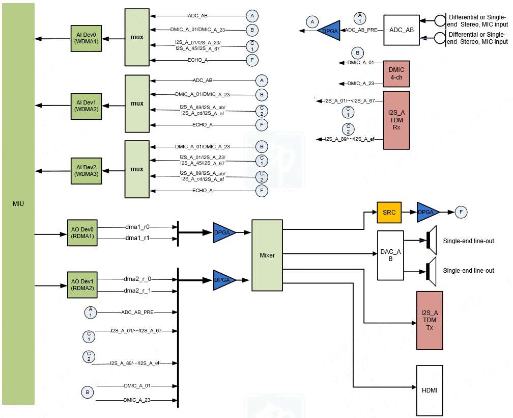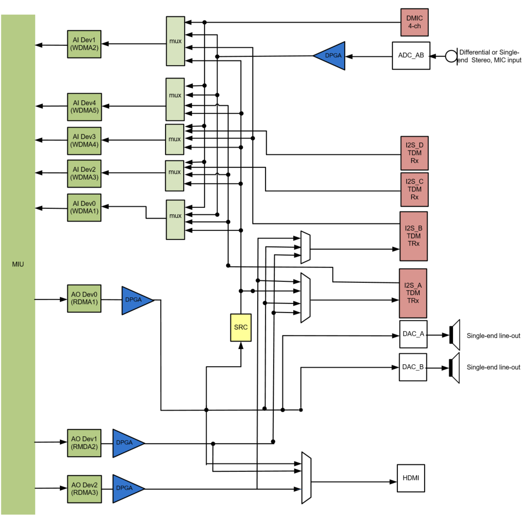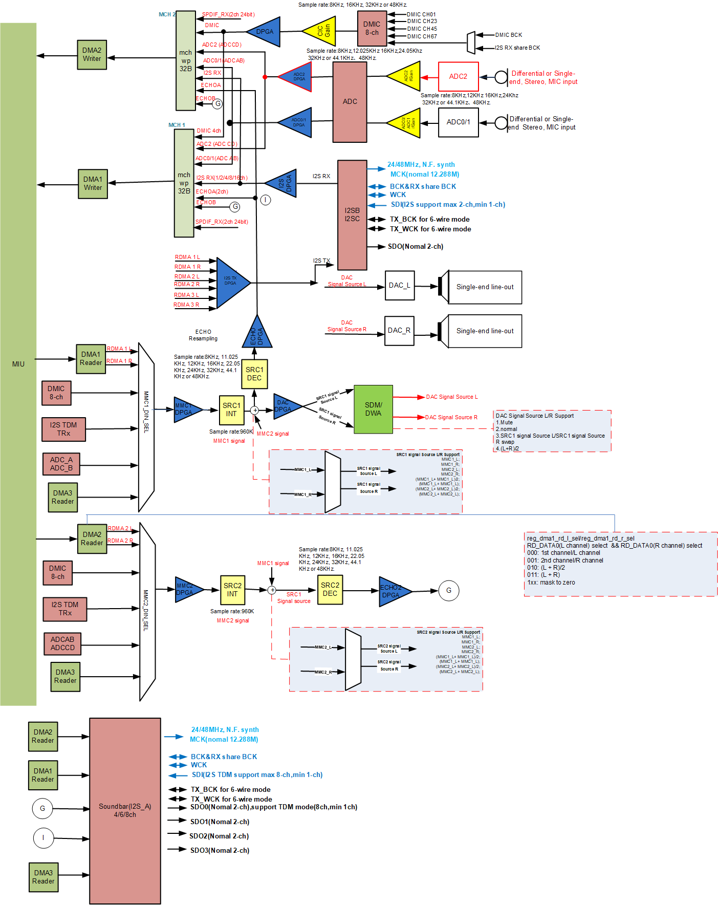 Mochi系列芯片的audio codec拥有如下资源:WDMA * 3, RDMA * 2, DMIC接口(可支持4Chn DMIC信号) * 1, ADC(可支持2Chn Amic/Linein) * 2, I2S-TDM RX(16 slot) * 1, DAC(可支持2Chn Lineout) * 2, SRC * 1, HDMI TX * 1。