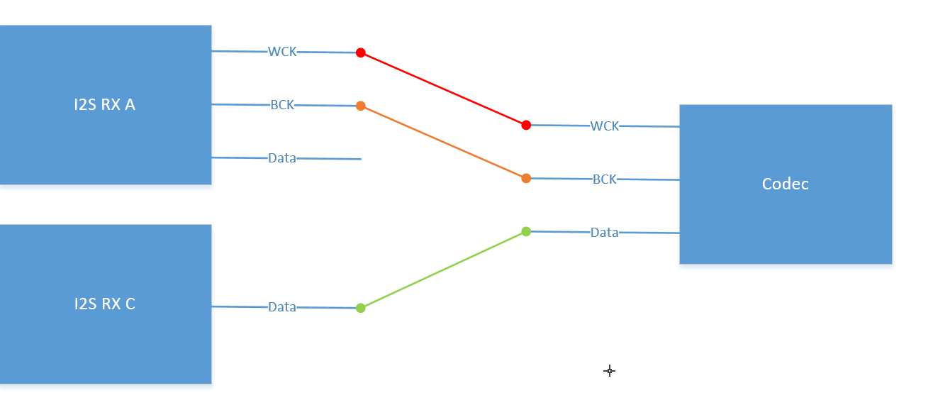 Muffin系列芯片拥有I2S RX * 4,但I2S RX C和I2S RX D有两种模式,一种称为share mode,一种称为slave mode。share mode,I2S RX C和I2S RX A共享I2S Clock(Wck以及Bck),I2S RX D和I2S RX B共享I2S Clock(Wck以及Bck),当需要同时使用I2S RX A和I2S RX C时,两者的I2S 参数必须完全一致,与I2S RX C对接的Codec需要将I2S Clock引脚(Wck以及Bck)与I2S RX A的I2S Clock(Wck以及Bck)相接, Data引脚与I2S RX C的Data相接,硬件接法如下图所示。I2S RX D与I2S RX B的关系也如同I2S RX C和I2S RX A一般。slave mode,I2S RX C和I2S RX D拥有独立的时钟,但只能作为slave使用。这两种模式可以通过dts sound节点下的i2s-rx-mode来设置,0为slave mode,1为share mode。