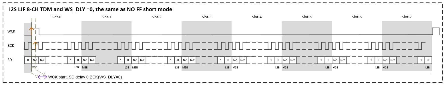 I2S支持short FF mode(通过dts中的节点i2s-rx-short-ff-mode/i2s-tx-short-ff-mode来配置),支持WS_DLY=1~3,其中WS_DLY=0即NO short FF mode。