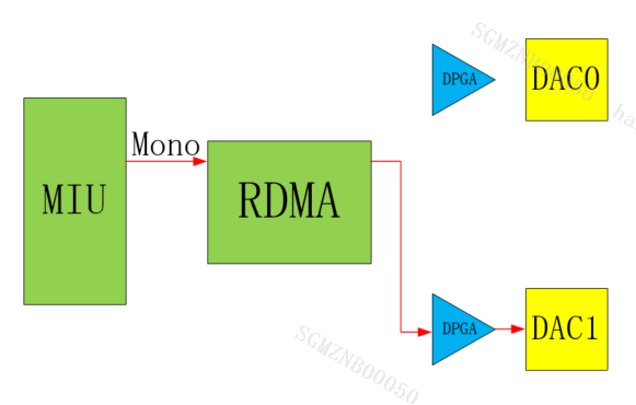Passthrough指的是不经DMA直接将数据流从AI设备传送到AO设备的通道。以ADC_AB→DAC_AB为例,如下图红色标注的通路: