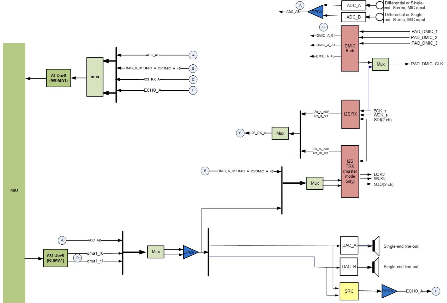 Mochi系列芯片支持输入设备为ADC_AB/DMIC_A_01/ DMIC_A_23/I2S_A_01/…/ I2S_A_EF到输出设备为DAC_AB/I2S_TX/ HDMI的任意组合Passthrough。Mochi系列芯片目前Passthrough的限制为:仅支持采样率48K; Passthrough Device暂不支持Channel Mode设定; Passthrough + DMA混音场景时,输出设备仅支持DAC_AB。