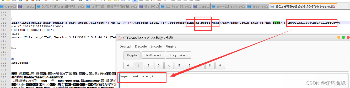 尝试使用 nodepad++打开 pdf,搜索 flag,可以看到有 flag,但是解密后是 flag 是错误