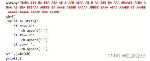 s = 'BABA BBB BA BBA ABA AB B AAB ABAA AB B AA BBB BA AAA BBAABB AABA ABAA AB BBA BBBAAA ABBBB BA AAAB ABBBB AAAAA ABBBB BAAA ABAA AAABB BB AAABB AAAAA AAAAA AAAAB BBA AAABB' s1 = s.replace('A', '.') s2 = s1.replace('B', '-') print("第一种:/n",s2) s3 = s.replace('A', '.') s4 = s3.replace('B', '-') print("第二种种:/n",s4)