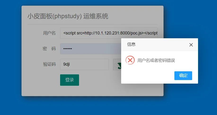 首先在用户名登录的地方插入弹窗的xss代码验证是否存在漏洞