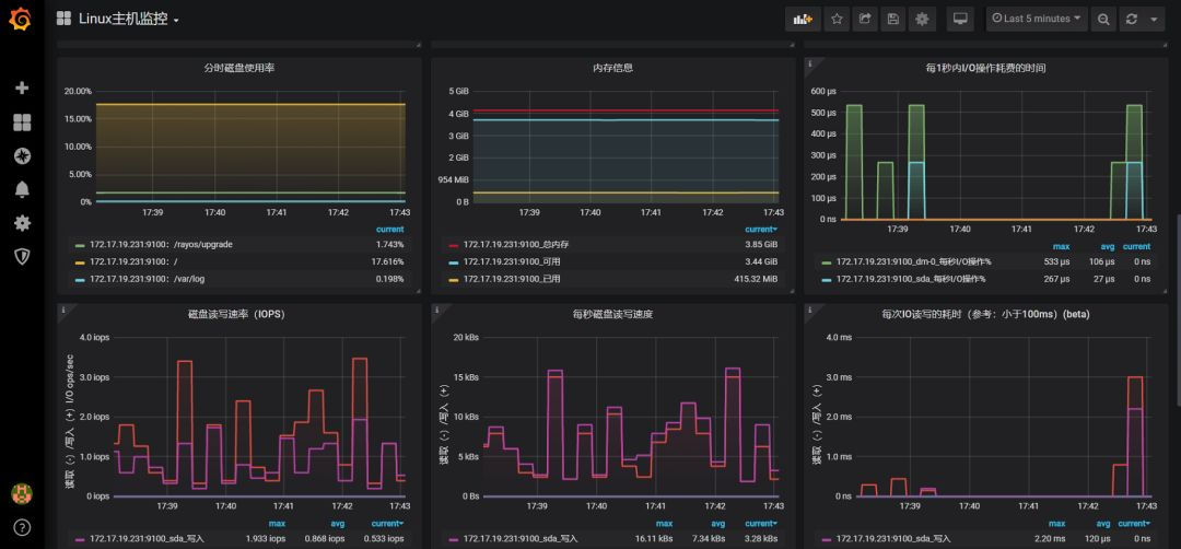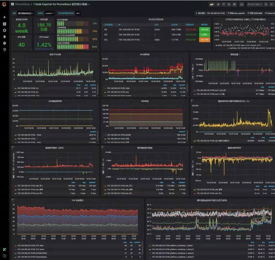 首先考虑的当然是 Zabbix 或者普罗米修斯了。因为都不要钱,而且还实用。但由于考虑到数据源比较多,种类各不相同,图形炫酷方面最后还是选择了普罗米修斯。因为现在在公司还是能够有一定的话语权的,所以就选择了这个。先大概上一个监控效果图,领导看后喜出望外,跟包了个二奶一样。