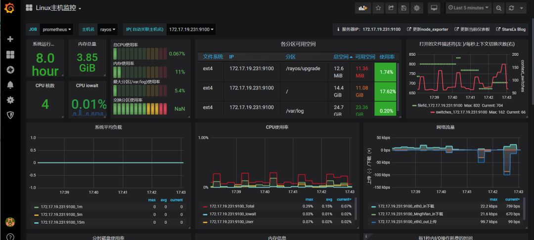 看起来还可以吧,其实实现的原理也较为简单,就是利用 node_exporter 去抓取数据,给普罗米修斯,普罗米修斯在前端展示相关指标,最后发送给 grafana,利用 grafana 汇出炫酷图形,也就是用户直接看到的。