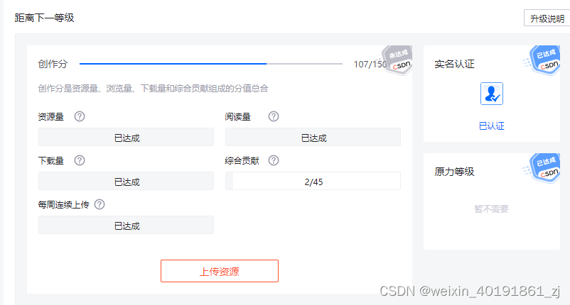 从上面的截图来看,右边的实名认证和原力等级的要求都已经通过,左边的资源量、阅读量、下载量、每周连续上传的指标都已经达成,需要150分既可以升级为LV4,现在的积分是102,缺少150-102=48分,这也正好是综合贡献的缺少分数, 这个分数已经好久了,一分未长,但下载我资源的情况时有发生,原因何在呢?