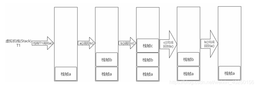 每一个被线程执行的方法,为该栈中的栈帧,即每个方法对应一个栈帧。每调用一个方法,就会向栈中压入一个栈帧;一个方法调用完成,就会把该栈帧从栈中弹出。