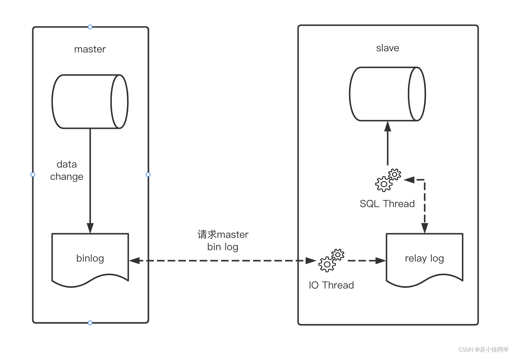 mysql 主从同步三种模式:异步复制、半同步复制、全同步复制今天我们就来看下这三种同步模式的优势和劣势异步复制异步复制是mysql 默认的同步方式在master为slave开通账号密码、ip授权之后,slave 可以从master进行数据同步,主要依赖的是master的binlog日志slave会启动两个线程,IO Thread 和 SQL ThreadIO Thread 负责从master拉取binlog 日志,并写入relay中继日志SQL Thread 负责将relay中继日志中的